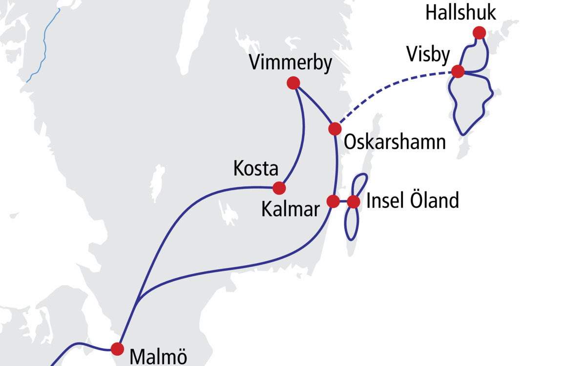 Die Insel Gotland, die zweitgrößte Ostseeinsel, kann auf eine bewegte Vergangenheit zurückblicken. Zahlreiche antike und mittelalterliche Münzfunde zeugen von der Bedeutung der Insel als frühzeitlicher und mittelalterlicher Handelsstützpunkt in der Ostsee. Die Inselhauptstadt Visby mit ihrer mächtigen Stadtmauer und den kleinen, teilweise mittelalterlichen Häusern gehört zum Weltkulturerbe der UNESCO. Gotland wird auch als Insel der Kirchen bezeichnet. Ca. 90 Kirchen aus unterschiedlichen Epochen sind auf der Insel zu finden. Die schönsten werden Sie auf Ihren Rundfahrten sehen. Auf Ihrem Weg nach Gotland lernen Sie typisch schwedische Landschaften kennen, besuchen einen Elchpark und erkunden auf der Rückreise die einzigartige Insel Öland.