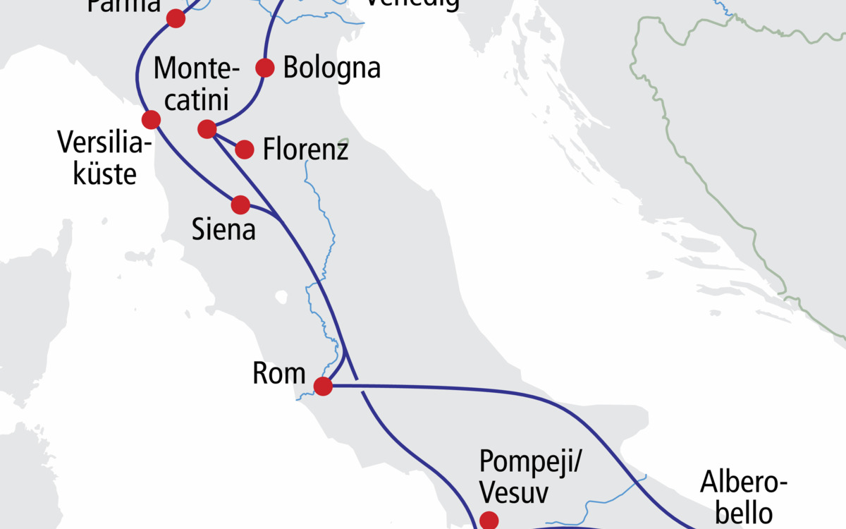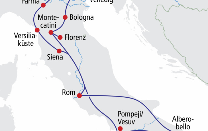 Kommen Sie mit uns auf eine faszinierende Rundreise durch „Bella Italia“ und entdecken Sie einige der schönsten und spannendsten Städte und Regionen Italiens und erleben Sie, welche einmaligen kulturellen Facetten und spannenden Geschichten das Land zu bieten hat. Städte wie Verona, Venedig, Florenz und Rom - um nur einige zu nennen - mit ihren fantastischen Sehenswürdigkeiten ziehen jeden in ihren Bann. Dazu landschaftliche Highlights wie die Toskana, die Amalfiküste und zum Schluss der Gardasee werden Sie faszinieren.
