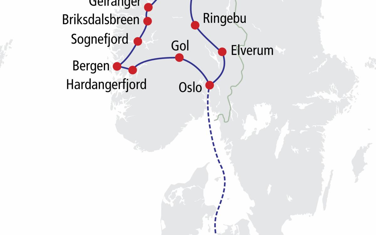 Erleben Sie Norwegen in all seinen Facetten. Der Geirangerfjord, eine Schifffahrt (Tagespassage) entlang der Küste, einzigartige Serpentinenstraßen wie der Trollstigen und die Adlerkehren sowie die berühmte Atlantikstraße gehören auf dieser Reise ebenso zu den Höhepunkten wie die Besuche von Oslo, Trondheim und der alten Hansestadt Bergen. Ein Aufenthalt am Sognefjord und eine Fahrt zum größten Festlandgletscher Europas stehen ebenfalls auf dem Programm.