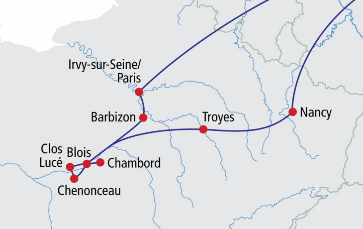 Sie verlassen das Loiretal und besuchen auf Ihrem Weg nach Nancy, die ehemalige Champagne-Hauptstadt Troyes mit einer sehr schönen Altstadt. In charmanter Begleitung gehen Sie auf Entdeckungstour und sehen die vielen farbenprächtigen mittelalterlichen Häuser mit ihren Fachwerkmauern, Spitzgiebeln, Erkerbauten und Türmchen, eine wahre Augenweide! Schließlich erreichen Sie die schöne Jugendstilstadt Nancy, wo Sie am Abend in einer typischen Brasserie noch einmal die französische Küche genießen.
