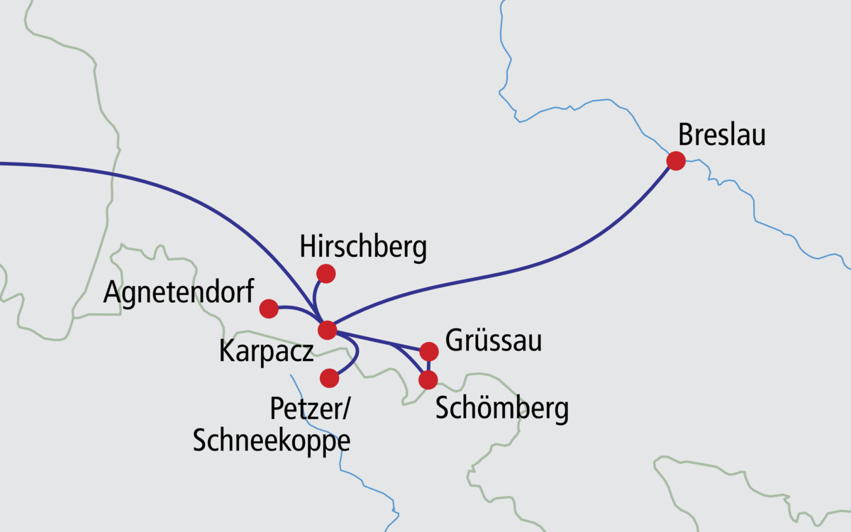 Das Land des launischen Berggeistes Rübezahl wartet mit einer Vielzahl von Überraschungen auf. Sie kommen in die beliebtesten Ferienorte des Riesengebirges, in denen am Fuße der Schneekoppe malerische Schluchten, Wasserfälle, skurrile Felsformationen und die Auffahrt auf die Schneekoppe beeindrucken. Von hier aus geht es zum Stonsdorfer Schloss im Hirschberger Tal und zur prachtvollen Klosterkirche in Grüssau. Einen Abstecher wert ist Breslau mit einem prächtigen Marktplatz, der Dom- und Sandinsel und weiteren Sehenswürdigkeiten.