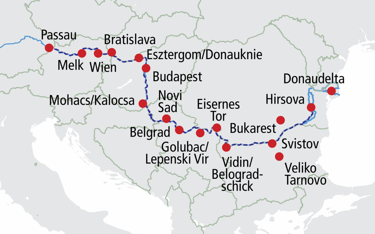 Charmante Metropolen und gemütliche Städtchen erzählen entlang dieser wunderschönen Donaureise von einer prunkvollen Vergangenheit. Die Ufer der Donau präsentieren dabei ursprüngliche Natur, prachtvolle Bauwerke aus der Barockzeit und historische Kleinode. Von Passau aus führt Sie diese Reise über Wien, das Donauknie, Serbien, Rumänien zum Donaudelta und zurück über Budapest, Bratislava und durch die Wachau nach Passau. Während Ihr „schwimmendes Hotel“ die Donau entlanggleitet, ziehen zwei Jahrtausende europäische Geschichte an Ihnen vorbei. Ein Höhepunkt dieser Reise ist das Donaudelta, eines der letzten Naturparadiese Europas.