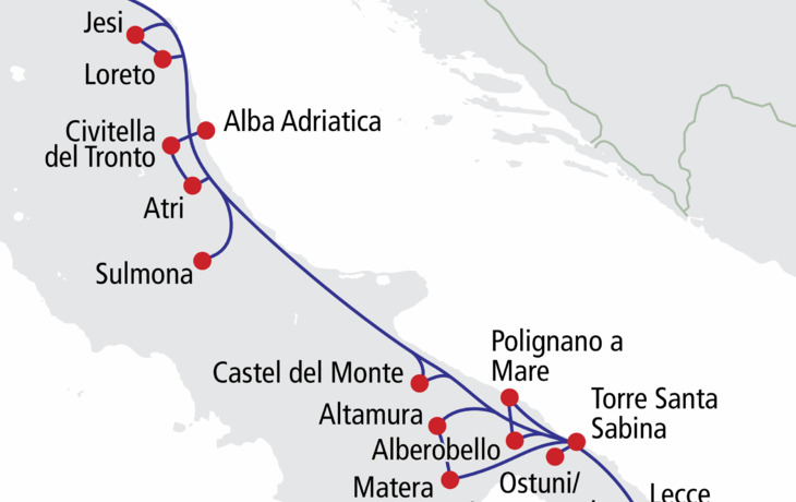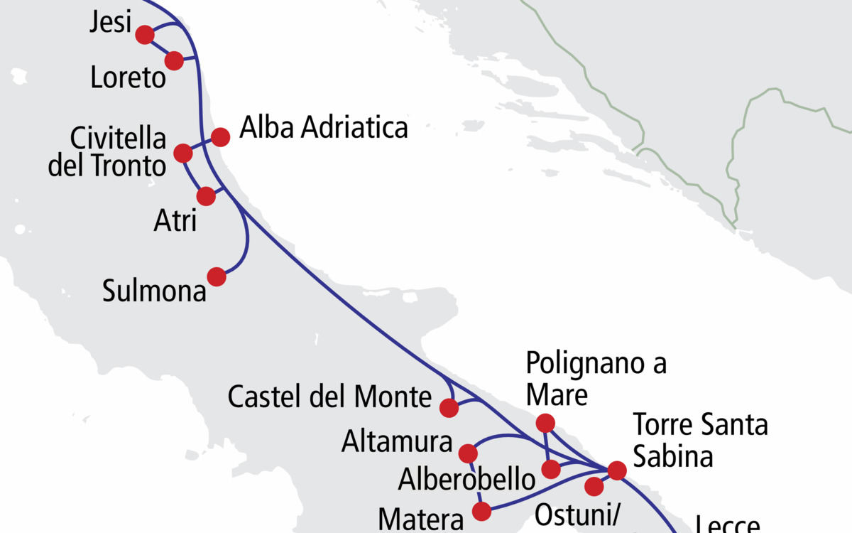 Von der grünen Gebirgswelt der Abruzzen, entlang der Adria mit ihren malerischen Küstenstraßen und bis zum Stiefelabsatz Italiens - diese einmalige Reise ist nicht nur ein atemberaubender Mix landschaftlicher Schönheiten. Hier haben gleichermaßen die Griechen, Byzantiner, Römer und Staufer ihre Spuren hinterlassen, die unterschiedlicher nicht sein könnten. Schlendern Sie durch arabisch geprägte Altstädte, machen Sie eine Zeitreise ins Mittelalter, erleben Sie barocke Prachtentfaltung, bestaunen Sie die zeitlosen, traditionellen Rundhäuser und Höhlenwohnungen und genießen Sie immer wieder das azurblaue Wasser, das sanft an die Küsten spült. Abwechslungsreiche Tage erwarten Sie in dieser Region zwischen Himmel, Meer und unendlich vielen Schätzen.
